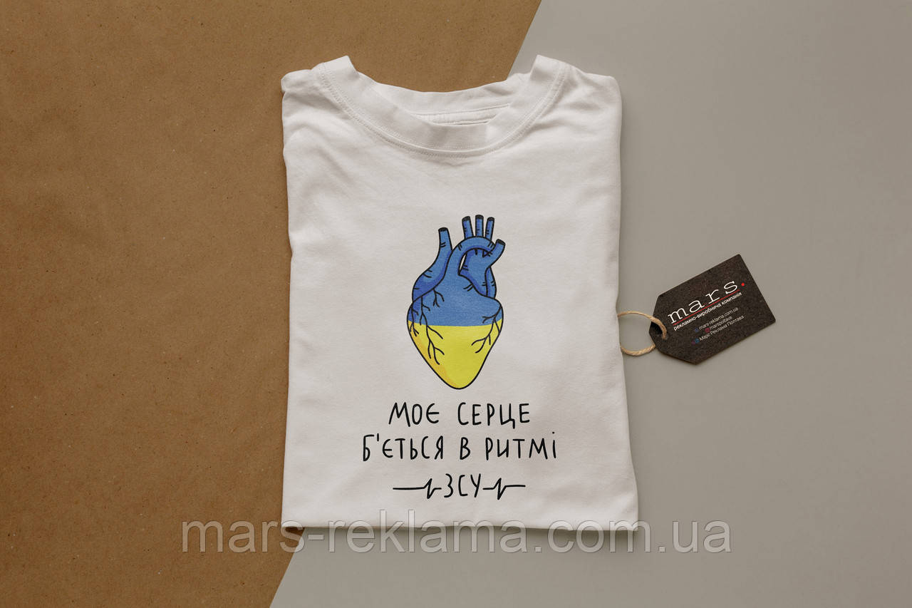 Футболка Моє серце б'ється в ритмі ЗСУ Чорна, біла.